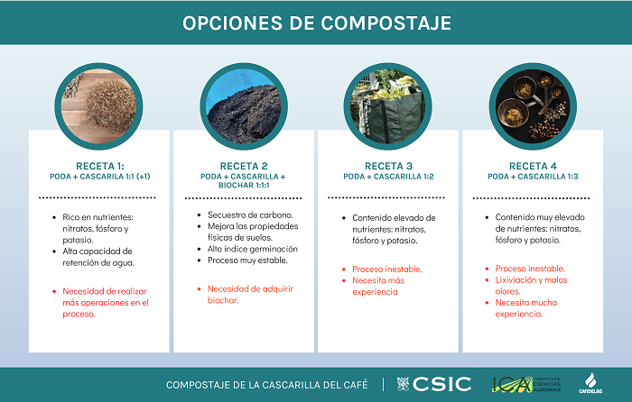 En la cascarilla de café se evidencia un alto contenido en nitrógeno, fósforo y potasio, los tres nutrientes principales para las plantas, así como una elevada capacidad de retención de agua, que podría mejorar el balance hídrico de los suelos. Para optimizar el proceso de co-compostaje se han utilizado otros residuos, tales como restos de poda y jardinería, y biochar o biocarbón, que permiten obtener mezclas con unas características químicas y una aireación óptimas.
