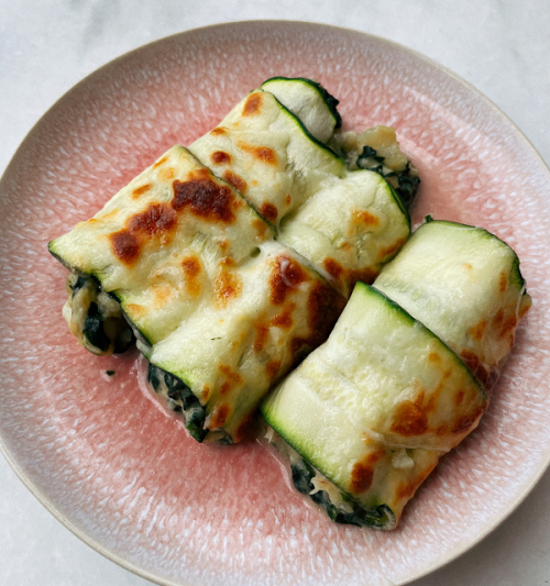 6.Recupera las tiras de calabacín y colócalas de tal manera que puedas colocar el relleno y montar un canelón con cada una de ellas.