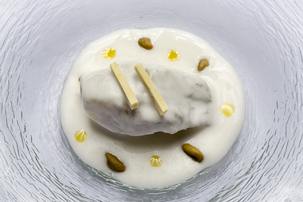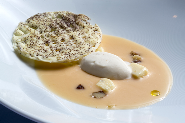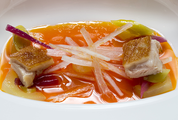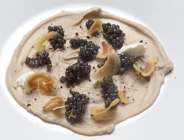 Ejemplo de algunos platos para degustar con cuchara son el Cogollo a la crema y aguacate (presente en ambos menús). En esta receta el producto se trata de una forma muy sorpresiva, completamente diferente a la que está acostumbrado el comensal: el cogollo se revela suave y fundente, nada crocante. U otros como el Caviar con panacota de tuétano, crema ácida de cacao y leche tostada ; el Jugo de callos; o el Salmonete con crema de puerros.