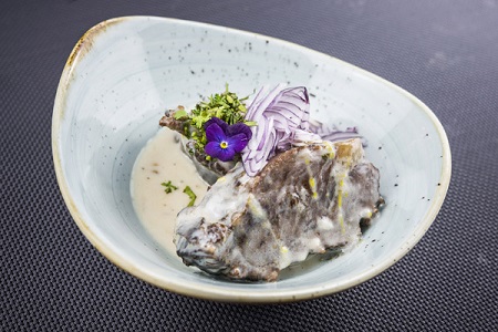 Molleja de ternera crujiente con berenjenas a la llama y su jugo