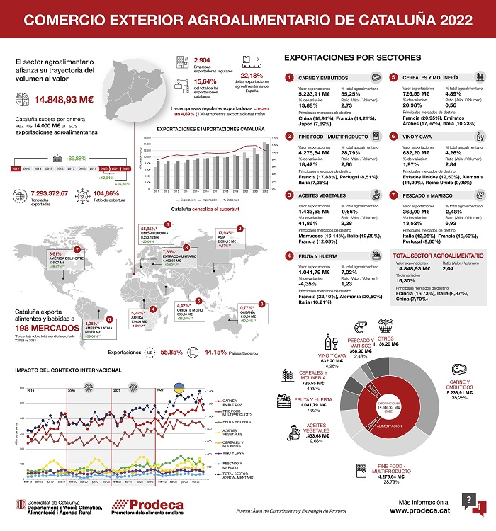 PRODECA – Departamento de Acción Climática, Alimentación y Agenda Rural ha presentado esta mañana los datos de exportaciones agroalimentarias catalanas del año 2022, a partir de los datos que ha hecho públicas la AEAT (Agencia Estatal de Administración Tributaria). Cataluña ha superado por primera vez los 14.000 millones de euros en sus exportaciones (14.848,94 M€), aumentando un 15,30% en valor en comparación con los datos de 2021. El decrecimiento en volumen (-4,23%) responde al impacto de la baja producción del sector de la fruta y huerta (a causa de factores climatológicos) y de los cereales y molinería (directamente afectados por el conflicto de Ucrania y usados este 2022 por autoconsumo). De hecho, si se dejan de banda estos dos sectores, las exportaciones del sector agroalimentario se mantienen en volumen (+0,17%). Aun así, se trata de una cifra menor a la media del Estado (-6,01%) y en la línea de la UE.