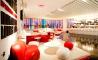 A través de una entrada de leds y un pasillo protagonizado por los colores que visten el local, -el rojo, el negro y el blanco- se extiende un suelo de brillante purpurina que conduce al cliente a cuatro zonas diferenciadas. Nada más entrar, le recibe una barra de color blanco en la que se realizan todos los pedidos de los clientes tanto si son para tomar en el mismo local como si son take away.
