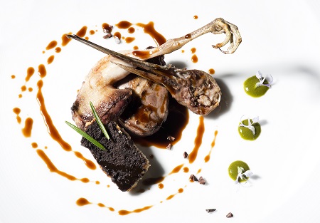 Entre estos nuevos platos de caza (toda es salvaje) se encuentra un excepcional Becada asada, este ave, conocido y apreciado desde la época de los romanos, al ser migratoria, siempre se encuentra en estado salvaje y nunca en cautividad, por lo que su alimentación es 100% natural. Ricardo la asa, manteniendo toda su jugosidad y la sirve con un glaseado de salsa y unas gotas de cacao, alegoría a la preparación tradicional, “en salmis”. Otra de las estrellas de la carta es la Codorniz asada con Kalamata, ravioli de caza y apionabo, receta que explica muy bien el espíritu del restaurante: gastronomía tradicional asturiana reinterpretada con una creatividad infinita. Lo mismo sucede con la singular Pierna de ciervo macerada en algas y salazón de anchoas. En ella se funden el mar y la montaña en un interesantísimo juego de contrastes.