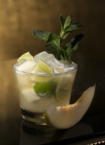 Preparación: Combinar todos los ingredientes en una coctelera de aluminio. Añadir las frutas y las hierbas. Añadir hielo. Agitar rápidamente por 8 a 10 segundos. Servir lentamente en un vaso con hielo. Añadir hielo fresco. Adornar con algunas ramas de mente y un trozo de sandía en un pincho.