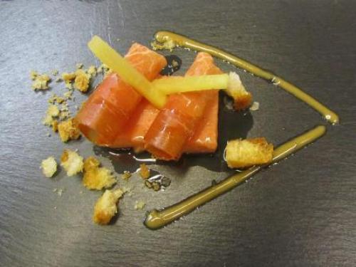 Manzana granny Smith: Se hacen tiras y se envasan con el aceite de albahaca, así la manzana absorbe el aceite. Se colocan las tiras encima del jamón o apoyadas en el jamón.