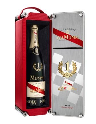 El estuche que lo alberga es de estética totalmente racing y conmemora todos los años de G.H.Mumm como champagne oficial de la Fórmula 1.