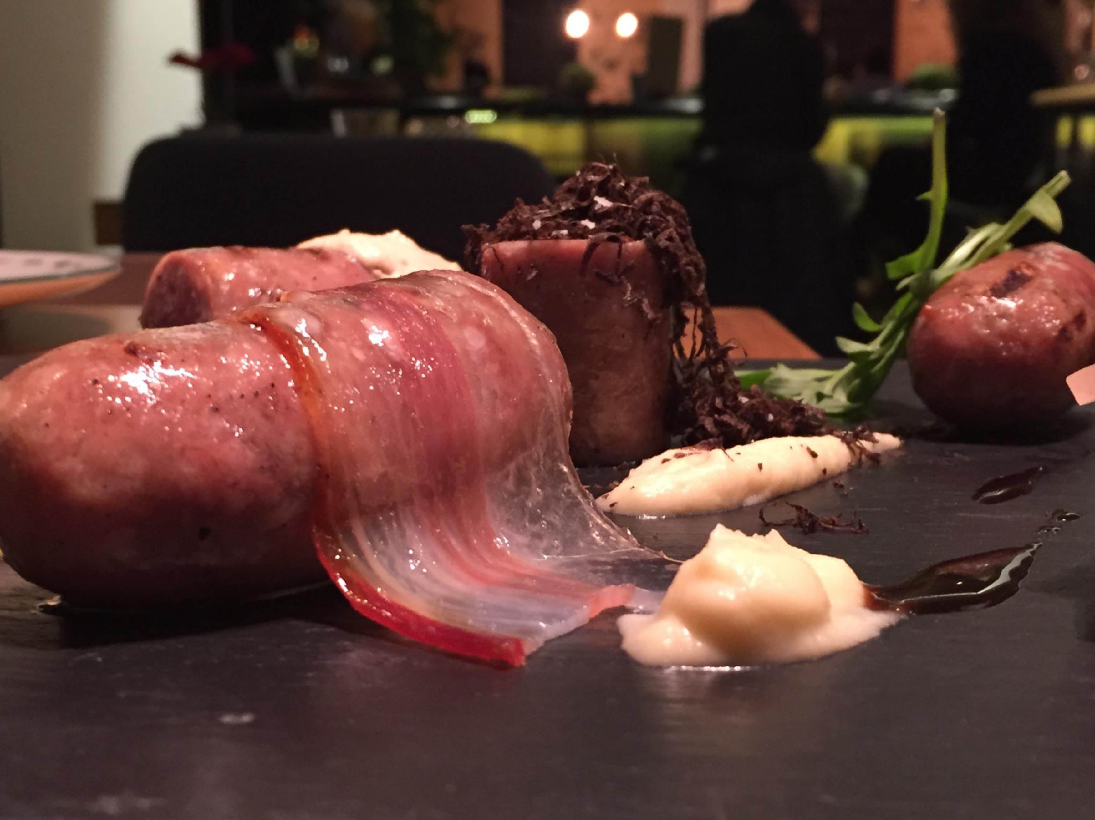 Longaniza artesanal de cerdo negro mallorquín con salsa de mostaza y trufa negra