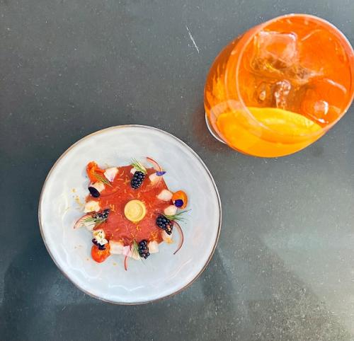 Un refrescante Ceviche que nos teletransporta a la comida peruana, elaborado de una forma sofisticada con un guiño a las raíces de la tierra. Un toque diferente que deleitará a los paladares más exigentes. Disfruta de esta exquisitez en El Café de La Ópera (c/ Arrieta, 6). Una tapa de ceviche de gamba con cebolla encurtida, frambuesa, tomate cherry osmotizado en Aperol, bombón de aceituna manzanilla, eneldo y pensamientos sobre un Bloody Mary con base de Aperol.