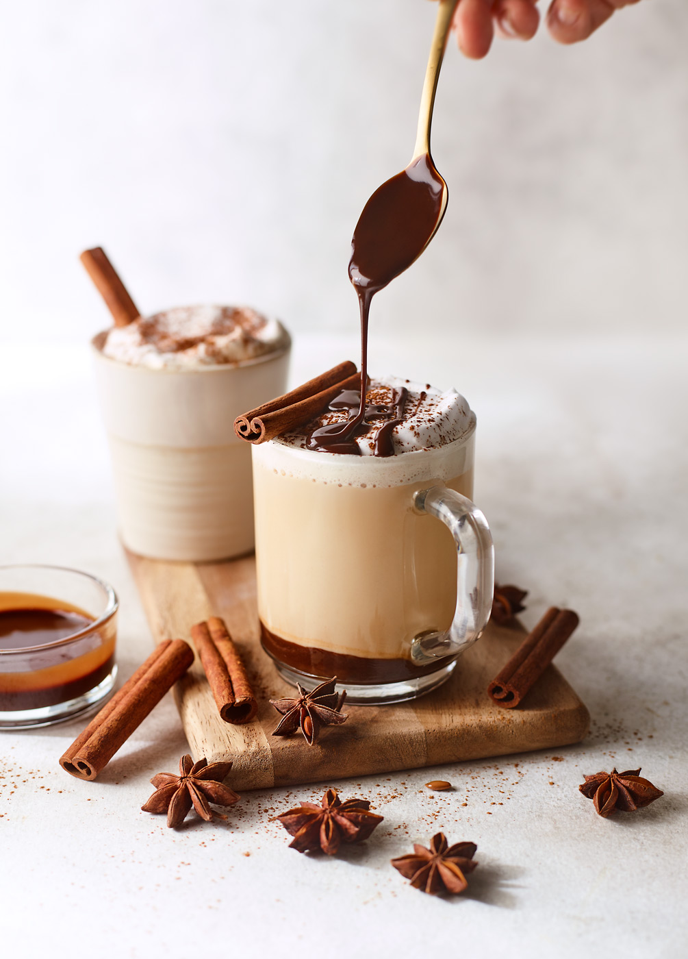 Calentar la bebida vegetal y espumar. En una taza poner una cucharada de sirope de chocolate y verter la bebida caliente con espuma. Decorar con canela en polvo y sirope de chocolate.