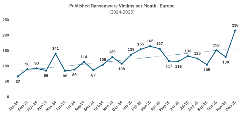 Víctimas de ransomware publicadas por mes – Europa (2024 – 2025).