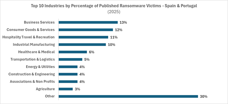 Las 10 principales industrias por porcentaje de víctimas de ransomware publicadas - España y Portugal (2025).
