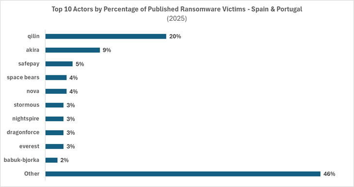 El informe también pone de manifiesto la fragmentación del ecosistema de ransomware. En España y Portugal, el grupo Qilin concentró el 20 por ciento de las organizaciones publicadas en sitios de filtración, seguido de Akira con el 9 por ciento y Space Bears y Nova con el 4 por ciento cada uno.
