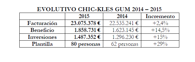 Chic-kles Gum, empresa de referencia del segmento de chicles y golosinas, ha cerrado 2015 con una facturación de 23,1 millones de euros, importe que representa un crecimiento del 2,4% frente a los 22,5 millones de euros de 2014. Sus ventas por volumen también han incrementado, concretamente un 4%, hasta los 45 millones de unidades gracias al