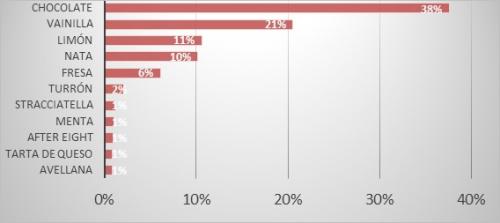 Los españoles y españolas coinciden en elegir el chocolate como su sabor preferido, con una mayor prevalencia en las mujeres, que escogen el chocolate en un 40%, mientras que los hombres lo hacen en un 35%. La vainilla es el segundo sabor tanto para hombres (24%) como para mujeres (18%). Tras ellos se sitúan otros sabores clásicos como la nata (10% en hombres y 11% en mujeres), el limón (11%, empatado con la nata en las mujeres) y la fresa (6%) completan el rango de sabores favoritos, seguido de otros, entre los que destacan el turrón, la stracciatella y la menta.