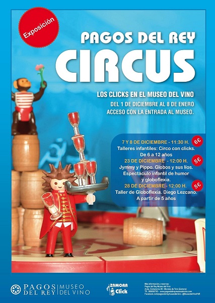 En el taller Circo con Clicks, además de conocer algunas de las instalaciones del museo y visitar guiados por Zamora Click, “Pagos del Rey Circus”, los pequeños realizarán su propia carpa de circo y caracterizarán muñecos de Playmobil con artistas de circo. Los talleres se desarrollarán los días 7 y 8 de diciembre a las 11:30 h., y están pensados para niños de 6 a 12 años, con un coste de 6 €.