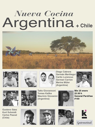 La cocina correrá a cargo de un total de ocho chefs - Germán Martitegui (Restaurante Tegui. Buenos Aires), Tomás Kalika (Mishiguene. Buenos Aires), Marina Müller (Cassis. San Carlos de Bariloche), Mauricio Giovanini (Messina. 1 *Michelin. Marbella.), Germán Carrizo y Carito Lourenço (Fierro. Valencia), Tato Giovannoni (Florería Atlántico. Buenos Aires), Kurt Schmidt y Gustavo Sáez (99 Restaurante. Santiago de Chile), Carlos Pascal (Kitchen Club. Santiago de Chile y Madrid)- y con el toque final del reconocido coctelero Diego Cabrera (Salmón Gurú. Madrid). Está claro que no hay nada como descubrir la riqueza culinaria propia de estos países de la mano de sus mejores embajadores.