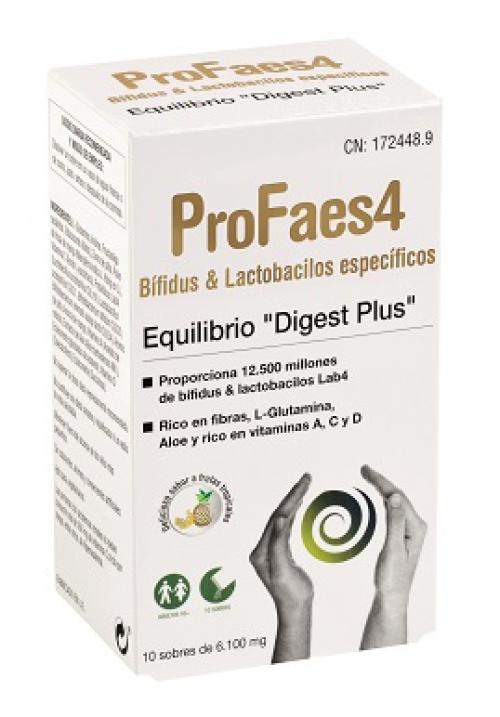 ProFaes4 Digest Plus, de Faes Farma, es el primer probiótico que contiene Lab4 -una combinación de cuatro cepas diferentes de bacterias beneficiosas- con glutamina y multinutrientes (vitaminas A, C, D; fibra; prebióticos y aloe vera). Cada cápsula contiene 12.500 millones de células vivas que ayudan a reestablecer el desequilibrio natural de la flora que produce malestar intestinal y distensión. ProFaes4 Digest Plus tiene un efecto beneficioso sobre la salud cuando se toma en las cantidades correctas. Lab4 cumple con los criterios de probióticos de alta calidad recomendados en los documentos de consenso europeos.