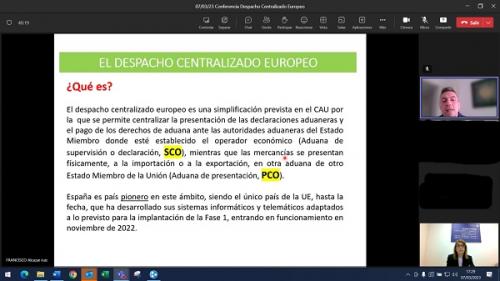 Francisco Alcázar Ruiz también explicó el funcionamiento del Despacho Centralizado Europeo: en primer lugar, la aduana supervisora (SCO) registra la declaración de aduana, realiza controles documentales tras la aceptación y, sin son necesarios controles físicos, informa a la aduana de presentación de la mercancía (PCO). Ésta decide si, para sus fines nacionales, es necesario realizar controles físicos e informa a la aduana de control de los resultados de estos.