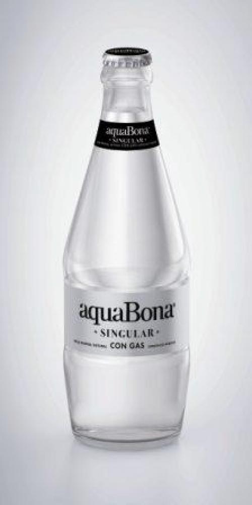 Con un envase moderno y actual en tonos plata y negro, Aquabona Singular estará disponible en el canal hostelería en formato de botella transparente de vidrio retornable de 365ml, un envase único en el mercado. El agua de Aquabona Singular procede del manantial de Santolín (Burgos).