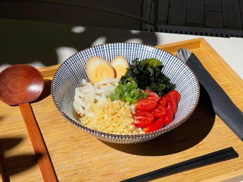 Este udon de verano llega con la siguiente combinación de ingredientes: virutas crujientes de tempura (tenkasu), tomate cherry fresco, algas wakame y un sabroso huevo marinado (ajitsuke tamago). Para quien prefiera una opción vegana se puede sustituir el huevo por tofu.
