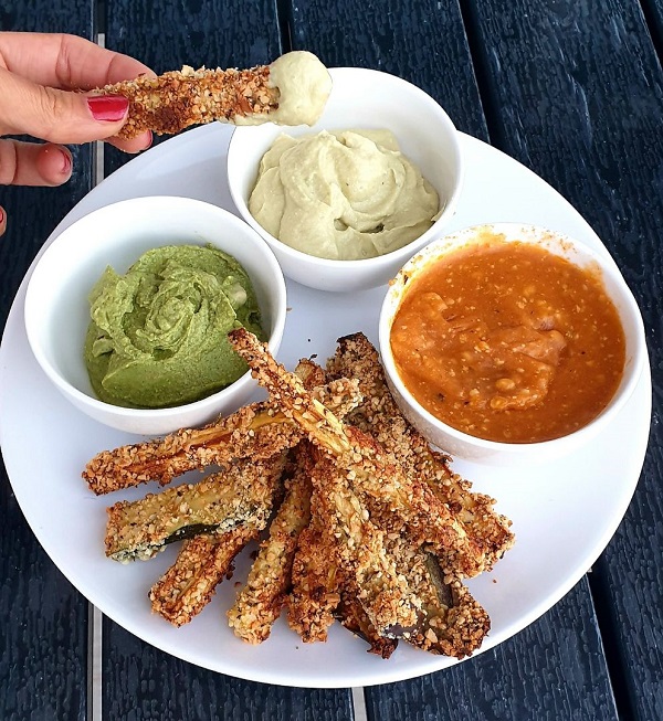1) Cortar la berenjena y el calabacín en palitos, rebozarlos con el huevo batido y con la mezcla de anacardos y almendras trituradas y las especies. Hornearlos a 200ª unos 20 minutos.