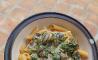 Pesto de aguacate: Albahaca, ajo, aguacate, pipas de calabaza, limón, sal y agua.