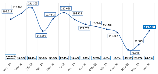 A pesar de que el incremento de junio es el mayor de los últimos doce meses, el volumen de contratos es un 31,8% menor al registrado el mismo mes de 2019, momento en el que se contabilizaron 219.160 firmas en el comercio.