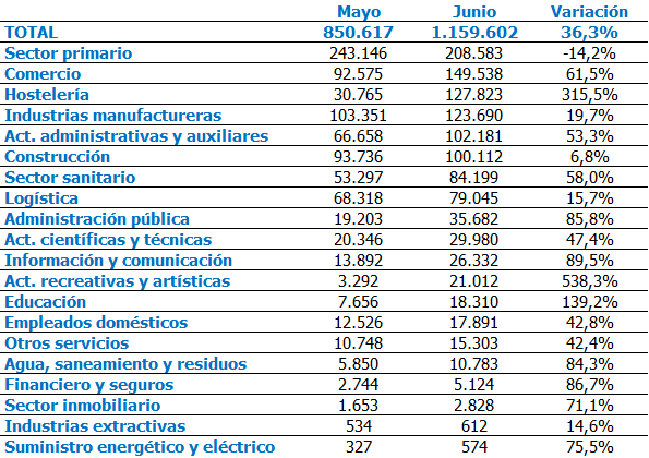 El incremento de la contratación en el sector comercial durante el mes de junio (61,5%) se sitúa 34,8 puntos porcentuales por encima del crecimiento conjunto de todos los sectores (36,3%), y supone un incremento similar a suministro energético y eléctrico (75,5), sector inmobiliario (71,1%), sector sanitario (58%), y actividades administrativas y auxiliares (53,3%).