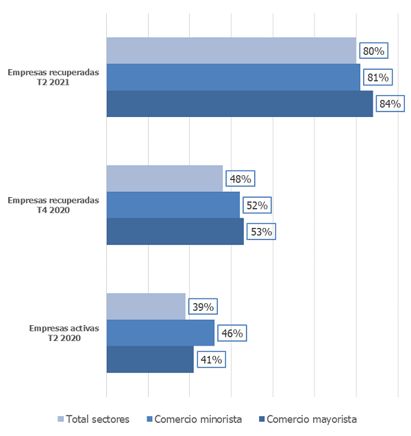 Los empresarios del comercio al por mayor son más optimistas, ya que el 84% de los pertenecientes a estas empresas confía en alcanzar la recuperación total de sus negocios durante el segundo trimestre de 2021, mientras que así opina el 81% de sus colegas del comercio al por menor y el 80% de los del resto de sectores.
