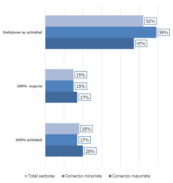 De hecho, según el informe de Randstad Research, el 59% de los empresarios del comercio minorista asegura haber reducido o detenido su actividad por culpa de la crisis sanitaria, mientras que en comercio mayorista el porcentaje es del 47% y la media del 52%.