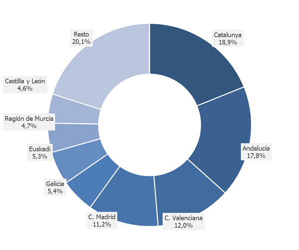 A distancia, con volúmenes más discretos y por debajo de los 10.000 contratos, se sitúan Galicia (8.102), Euskadi (7.941), la Región de Murcia (6.957), Castila y León (6.941), Castilla-La Mancha (5.507), Aragón (5.223), Canarias (4.714) y Extremadura (3.264). Las comunidades con menos números de contratos, por debajo de los 3.000, son Asturias (2.797), Baleares (2.728), Cantabria (2.660), Navarra (1.958) y La Rioja (835).