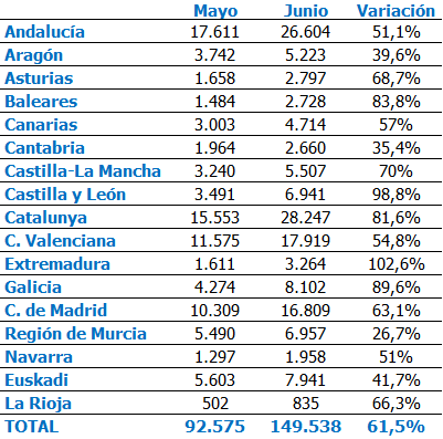 Por otro lado, con incrementos por debajo de la media del país, se encuentran Canarias (57%), la Comunitat Valenciana (54,8%), Andalucía (51,5%), Navarra (51%) y Euskadi (41,7%). Cierran la lista Aragón (39,6%), Cantabria (35,4%) y la Región de Murcia (26,7%).