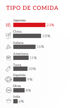 Si bien lo más pedido es la comida japonesa, el porcentaje de crecimiento de los pedidos de tipos de comida menos tradicionales, como la gourmet o la casera, ha crecido notablemente respecto al año anterior.