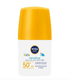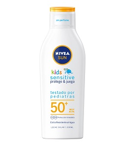 - Piel Sensible. Si la piel de los niños ya es delicada de por sí, hay niños cuya piel reacciona de forma especialmente sensible a la radiación solar, desarrollando intolerancias al sol o alergias solares. Para este tipo de piel es adecuado el uso de productos Sensitive, como la fórmula de NIVEA SUN Kids Protege & Juega Sensitive FP50+, en sus versiones en loción, spray pistola y roll-on solar. Esta fórmula testada por pediatras está desarrollada de forma específica para que los niños con piel sensible puedan disfrutar del sol sin preocupaciones, ya que protege su piel de forma inmediata de las quemaduras solares gracias a su fórmula de alta protección a los rayos UVB y UVA que reduce el riesgo de alergias inducidas por el sol, siendo extrarresistente al agua y sin perfume.