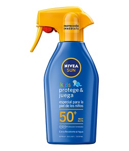 - A partir de los 3 años. Con esta edad, la piel de los niños empieza a tolerar mejor el sol, aunque siempre debemos exponerlos con protección solar inmediata muy alta y extrarresistente al agua, así como con prendas que les protejan mientras juegan al aire libre (gorra y camiseta de algodón). Para ellos, la fórmula de NIVEA SUN Protege & Juega Protección Muy Alta FP50+, en sus versiones Loción, Spray Pistola y Roll-On Solar les ofrece protección inmediata y fiable para disfrutar bajo el sol.