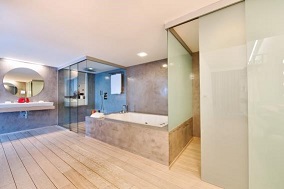 El reto del diseño de las estancias privadas consistía en organizar de forma elegante, pero funcional, un espacio generoso que sacara el máximo partido de la magnífica luz natural ibicenca. Sin embargo el desafío ha sido espectacularmente superado con la utilización de los sistemas de puertas correderas KLEIN®, que están presentes en todas y cada una de las 234 habitaciones del complejo, separando el espacio de agua del resto de la estancia mediante frentes acristalados móviles sin marcos, sutiles y minimalistas, que amplían visualmente las ya de por sí espaciosas suites.