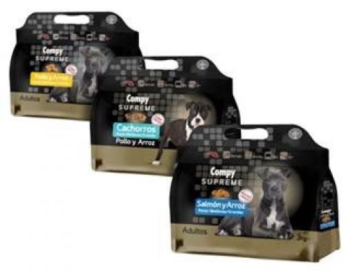 Bynsa Mascotas elabora tres recetas de, Compy Supreme: Salmón y Arroz Perros Adultos (con salmón fresco), Pollo y Arroz Perros Adultos y Pollo y Arroz Cachorros (con pollo fresco), que incorpora además otros ingredientes específicos para el aprendizaje, el pelo y las defensas naturales.