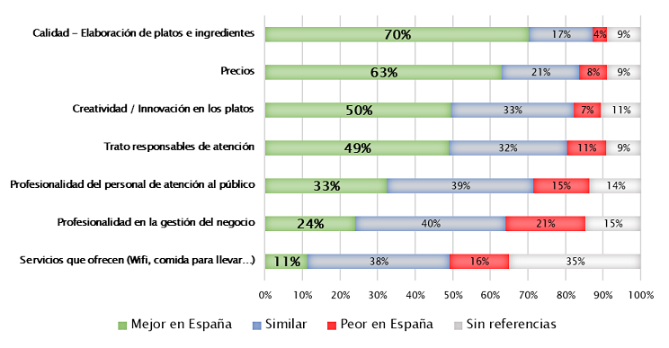 En consonancia con estos datos, cabe señalar que el consumidor español valora muy positivamente los establecimientos hosteleros de nuestro país, situándolos por encima de los extranjeros. Destacan favorablemente aspectos como la elaboración de los platos e ingredientes utilizados (70%), los precios (63%), la creatividad/innovación en su oferta (50%), el trato de los responsables de atención al cliente (49%) y la profesionalidad del personal de atención al público (32%). Por el contrario, las capacidades para gestionar el negocio y los servicios ofrecidos -Wifi, comida para llevar…- tienen una valoración similar o ligeramente superior en otros países.
