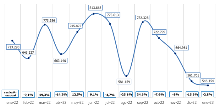 En estos últimos doce meses, el indicador ha variado considerablemente, registrado dos caídas pronunciadas, en abril (con 663.140 contratos), y tras contabilizar los máximos de la serie estudiada en junio (813.865), descender bruscamente en agosto (581.159). Desde septiembre, cuando se firmaron 782.328 contratos por parte de las trabajadoras, el volumen de firmas encadenó cuatro meses seguidos de caídas hasta los 546.154 contratos del pasado enero.