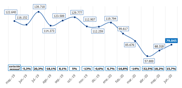 Analizando la evolución de la contratación desde mayo de 2019, se constata que hasta final de año, el volumen de firmas fluctuó entre 114.000 y 139.000 contratos mensuales. Desde enero de este año, cuando se firmaron cerca de 120.000 contratos, la cifra encadenó tres meses consecutivos de bruscas caídas, hasta tocar fondo con las 57.800 firmas del pasado abril, influenciado sin duda por la situación de confinamiento. En mayo, el volumen de contratación en logística se recuperó un 18,2%, hasta alcanzar las 68.318 firmas, volviendo a crecer en el pasado mes de junio, esta vez un 15,7%, y registrando 79.045 rúbricas