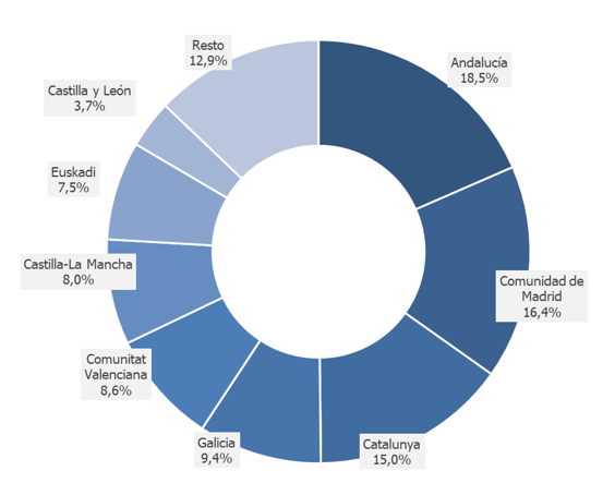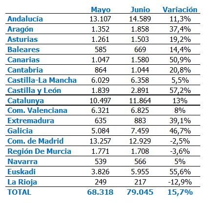 Los porcentajes de incremento fluctúan considerablemente teniendo en cuenta los diferentes volúmenes de cada región. El crecimiento más acusado del país se produce en Castilla y León (57,2%), seguida por Euskadi (55,6%), Canarias (50,9%) y Galicia (46,7%). También por encima de la media nacional (15,7%) se situaron Extremadura (39,1%), Aragón (37,4%), Cantabria (20,8%) y Asturias (19,2%).
