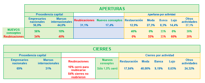 Se ha pasado de un mercado, que venía del 2005 de tener como protagonistas a las marcas internacionales de moda (con rentas promedio de 27.000 €/mes en locales comerciales de 170m2 en calles A, prime), a un nuevo protagonista en el retail de la mano de empresarios locales, Nuevos conceptos y el bienestar personal en locales, con alquileres de 10.000 €/mes de 70 m2 en calles B (Primera Línea) y en las NUEVAS protagonistas, las calles ZETa.