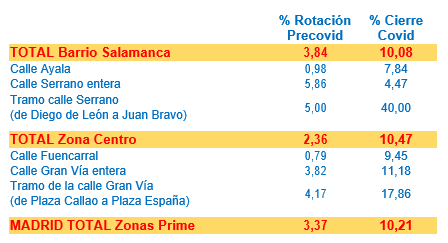 La calle Claudio Coello, que antes del Covid tenía un 2% de locales desocupados, ha pasado a tener durante el Covid el 17%; y el Paseo de la Castellana, en la zona entre Diego de León y Goya, que pasó del 5,5% antes del Covid a un sorprendente 33% en el Covid, lo que achacamos a que la zona es casi 100% de restauración directamente unida al consumo de las oficinas; por un lado porque el sector de la restauración ha sido el más afectado, junto con la moda; y por otro lado por la zona, la de oficinas, de nuevo la más afectada en el consumo, junto a las zonas residenciales.