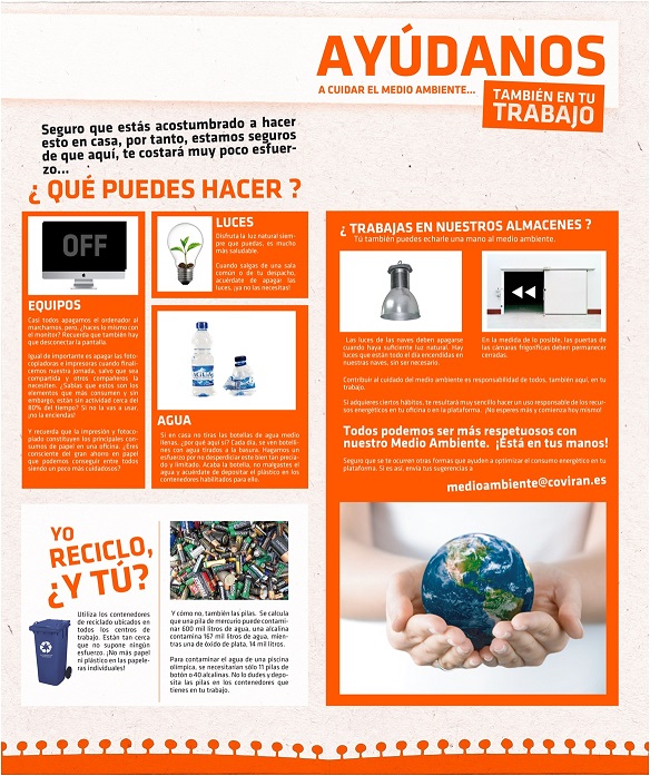 La cooperativa Covirán ha reducido en un 20% el consumo de agua durante el ejercicio 2014 gracias a la instalación de diferentes sistemas en sus 27 plataformas como temporizadores en la grifería o fluxómetros en los inodoros, que consiguen el ahorro de agua mediante el aumento de la presión. A estas acciones, se suman las importantes campañas de concienciación sobre un uso sostenible que han realizado tanto entre socios y empleados, como entre cliente final.