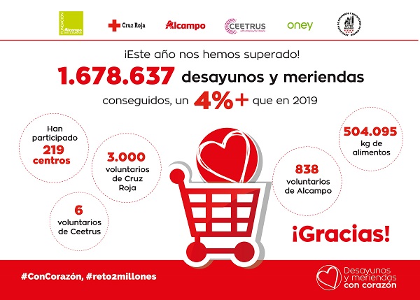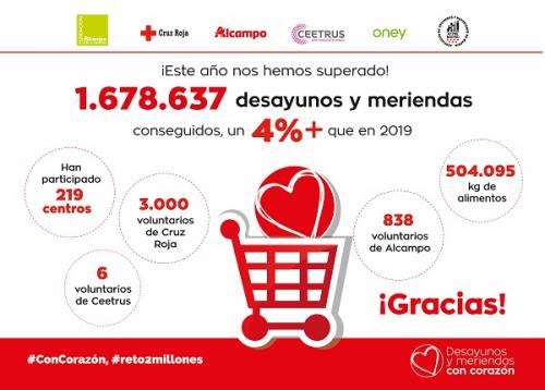 En esta campaña, en la que han participado más de 3.800 voluntarios de Cruz Roja y las empresas organizadoras, se han conseguido 1.678.637 desayunos y meriendas que Cruz Roja podrá repartir a familias del entorno de las tiendas Alcampo que estén en situación de vulnerabilidad.