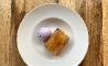 Torrija de brioche caramelizada con helado de violetas
