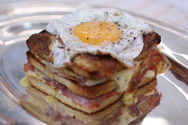 Elaboración: Dorar en una sartén las rebanadas de pan con mantequilla por ambas caras. Mezclar queso tierno + curado + yema de huevo + nata + pimienta. Sobre los panes poner parte de la crema de queso + jamón + crema, cerrar con panes + crema. Gratinar en el horno grill. En la sartén hacer los huevos a la plancha y colocarlos sobre los sándwiches.