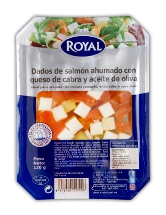 La empresa Copesco-Sefrisa, con la marca Royal como insignia, sigue apostando por el salmón ahumado y lanza al mercado una nueva referencia, los dados de salmón ahumado con queso de cabra, ideales para condimentar ensaladas y preparar canapés y aperitivos.