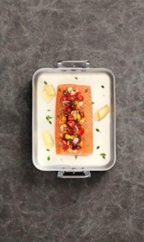 Introducir el lomo de Salmón Noruego fresco en una fuente refractaria. Salpimentar.
