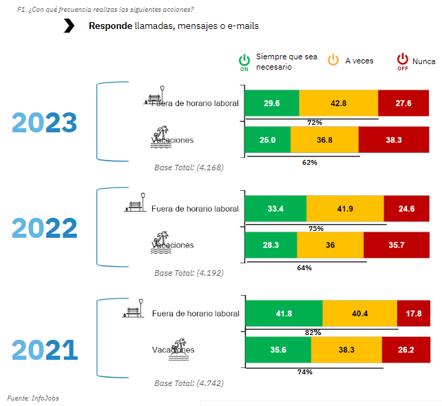 De acuerdo con los datos extraídos del último informe sobre Desconexión digital de InfoJobs, la plataforma de empleo líder en España, aunque todavía el 72% de los trabajadores españoles declara no desconectar del trabajo fuera del horario laboral, el dato es tres puntos porcentuales inferior al del año pasado (75%), y diez puntos porcentuales más bajo que el de 2021 (82%), lo que demuestra que la desconexión sigue mejorando poco a poco. El porcentaje de personas que no desconectan plenamente del trabajo se divide en un 29,6% que están conectadas siempre que sea necesario, y un 42,8% que lo hacen de forma esporádica.